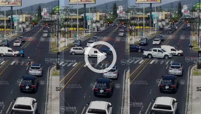 Este es el momento en el que un motociclista casi atropella a un peatón y terminó accidentado por no respetar la luz roja del semáforo. El hecho ocurrió sobre el Paseo General Escalón, San Salvador.
