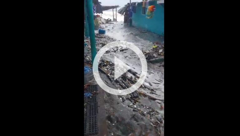 Con el oleaje alto, en los cortos se observan a algunos habitantes de la comunidad La Ostra, tratando de tomar objetos que son arrastradas por el agua marina.