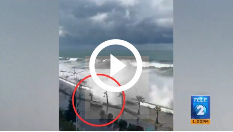 Justo una camioneta de color blando se encontraba en el sitio, cuando la primera ola (que llevaba una intensa velocidad y fuerza) logra arrastrarlo hasta otro sector de la misma calle, pero no lo suficiente para quedar en carril contrario.