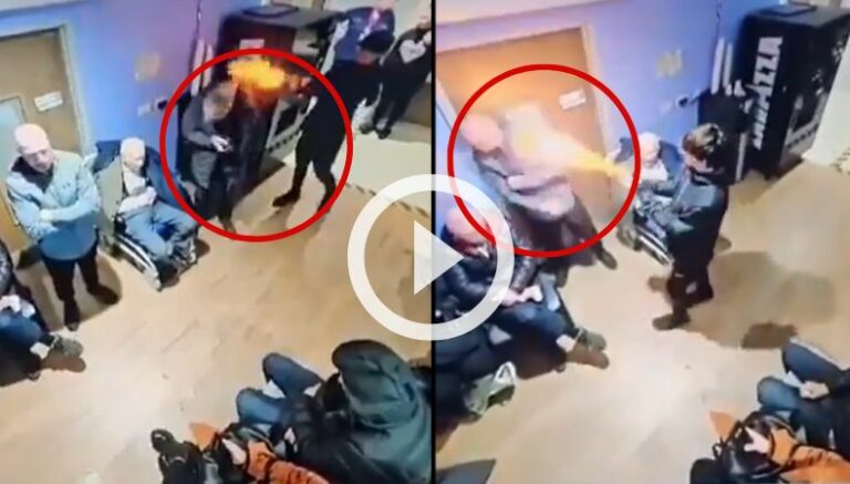 En el clip, que dura poco más de 15 segundos, se observa cuando un hombre (con ropa negra) llega a la sala de espera. De repente, se acerca a unos de los adultos mayores y le apunta en la cara con un artefacto que lanza fuego. El anciano reacciona con rapidez e intenta correr, pero el sospechoso lo persigue, con el fin de continuar atacándolo.