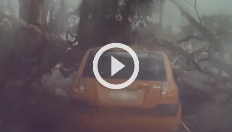 Las cámaras de seguridad registraron el momento preciso en el que un hombre se salvó de milagro, pues tan solo segundos después de que se movió del lugar, un árbol explotó tras el impacto de un rayo que hizo que los restos cayeron sobre el vehículo.