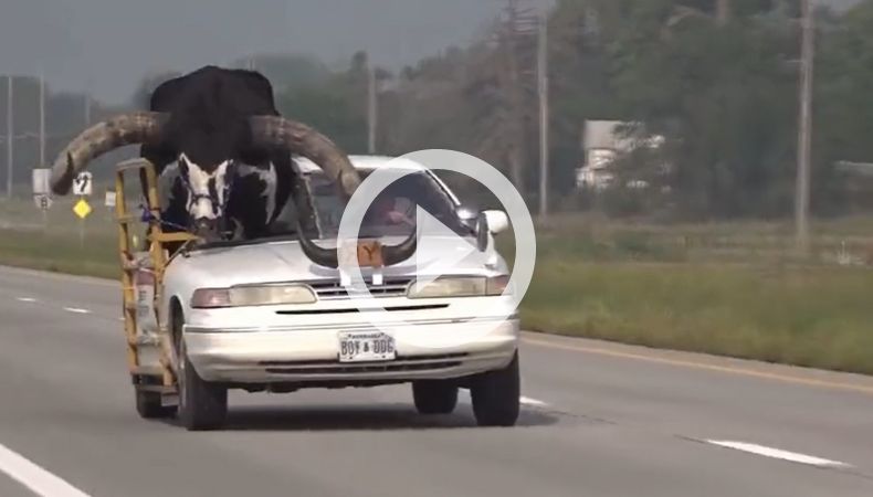 La policía detuvo a un hombre que circulaba en Nebraska con un enorme toro de copiloto. El carro fue modificado para moverlo.