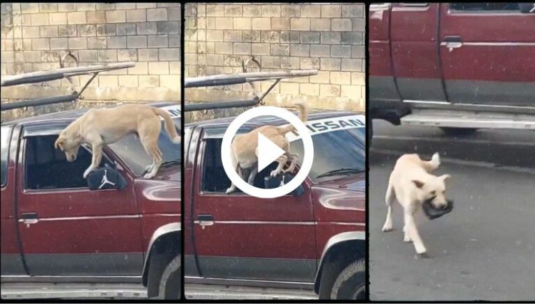 Las mascotas no dejan de sorprendernos. Este perrito, que se encuentra subido en la capota de un pick up que se encuentra estacionado sobre la vía, busca la forma en la cual puede llegar hasta la ventana del vehículo e ingresar. ¿Por qué? Es la pregunta.