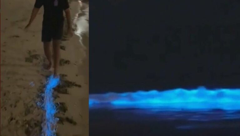 En el video que se muestra a continuación, se puede apreciar un azul fluorescente que, al moverse el agua o la arena, pareciera ser que se ilumina como una lámpara. Los expertos indican que ese brillo responde a un sistema de defensa en el que los organismos vivos buscan protegerse de sus depredadores.