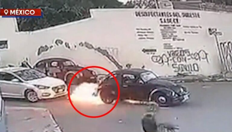 Este hecho quedó grabado por una cámara de videovigilancia y muestra el momento exacto en el que el coche está esperando avanzar en la vía cuando el automotor, de la nada, en la parte trasera, aparece una llamarada.