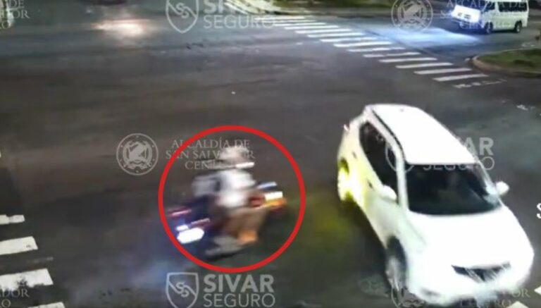 En el respectivo video se evidencia como el motociclista que circula sobre el bulevar Constitución, San Salvador, puso en riesgo su vida al no respetar el alto. También, se puede ver como cayó junto a su acompañante sobre el asfalto luego de casi colisionar con el conductor de una camioneta color blanca.