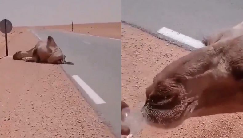 Un bondadoso gesto fue el que tuvo un conductor que iba justo en medio del desierto cuando se encontró con un camello que yacía sobre la arena, al borde la carretera, a punto de desfallecer. Al observar esta escena, el hombre se compadeció del animal y detuvo su trayecto para darle un poco de agua que le ayudó a mitigar su cansancio.