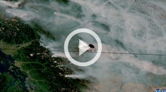 Mediante un video desde el espacio, se observa una enorme columna de humo que se levanta por el fuego, cerca de la frontera entre la Columbia Británica y el estado de Washington.