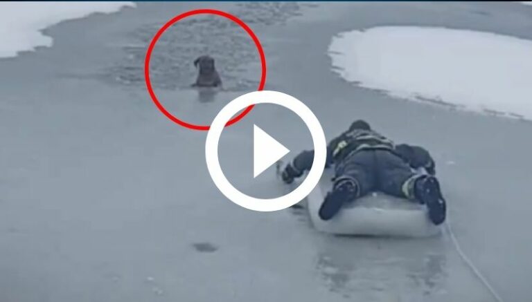 Sin embargo, mientras avanzaban, el perro se lanza de la balsa pensando que el hielo era tierra firme. Lo que no se esperaba era que la zona donde el pequeño salta rápidamente se hunde y este se vuelve a encontrar empapado y congelándose aún más. Pasan algunos segundos con el perro en el agua antes de que el bombero pueda volver a subir sobre la balsa.