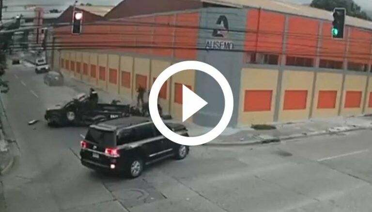 En Honduras, varios agentes de la Policía Militar del Orden Público (PMOP) de San Pedro Sula, en el norte del país, salieron volando del pick up donde se transportaban, luego de ser impactados por una camioneta. El hecho se registró en un semáforo de la zona y quedó grabado por las cámaras de seguridad de la zona.