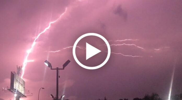 Sin embargo, en esta ocasión, un rayo sorprendió de pronto al lente de una cámara de celular. Como se puede apreciar, entre los rayos dispersos en las nubes, uno salió de lo común, puesto que se mira justo el momento en el cual el cielo “se enciende” por la luz que emite, logrando impactar cerca de una valla publicitaria.