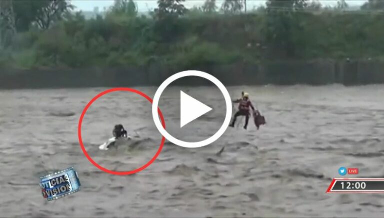 Sin embargo, la ayuda llega. Con arneses y con mucha astucia, un socorrista logra identificar e intervenir a quien se encuentra en la parte superior de su carro. Le hace llegar un chaleco salvavidas, mientras él baja hasta donde esta persona pide por su vida.
