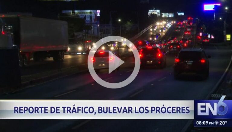 Esta noche se registra tráfico vehicular complicado en el bulevar Los Próceres, para quienes vienen del occidente del país y bulevar Monseñor Romero y buscan San Salvador, la autopista a Comalapa y 49 avenida Sur. La mayor complicación se encuentra en la incorporación del bulevar Monseñor Romero al bulevar Los Próceres.