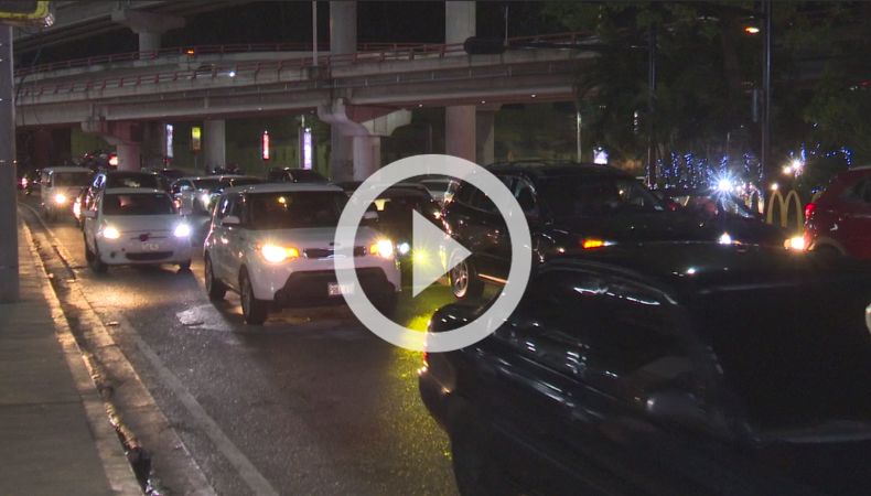 Esta noche, el tráfico se encuentra bastante complicado en el redondel Naciones Unidas para los automovilistas que buscan incorporarse a la carretera Panamericana en dirección a Santa Tecla, a la altura de centros comerciales.