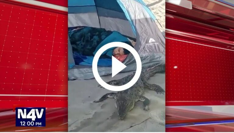 Tal y como se observa en la imagen, mientras esta personas se encontraba acostado en el interior de su tienda de campaña, a pocos centímetros (literal) se acercó un cocodrilo, quien, al parecer, no se percató de la presencia del sujeto.