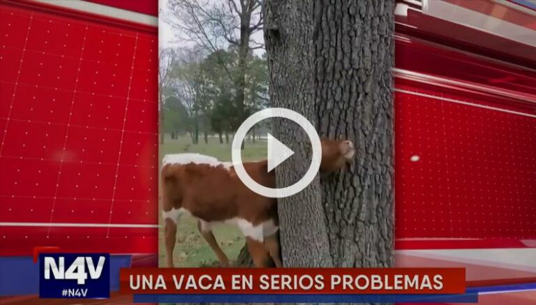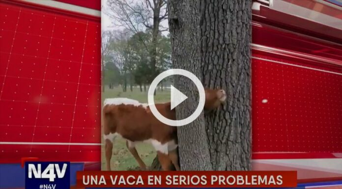 En las redes sociales se ha viralizado un rescate inusual que ocurrió en una granja, momento que puso en apuros a una joven vaca quedando atrapada en las ramas de un árbol.