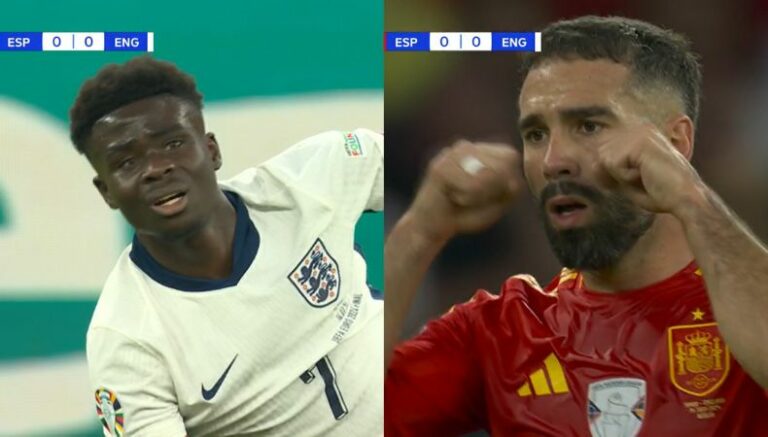 Bukayo Saka inició una corrida desde el mediocampo, pero su avance fue frenado por una falta de Dani Carvajal. El combinado de los Tres Leones pidió la tarjeta para el defensa de la Roja.