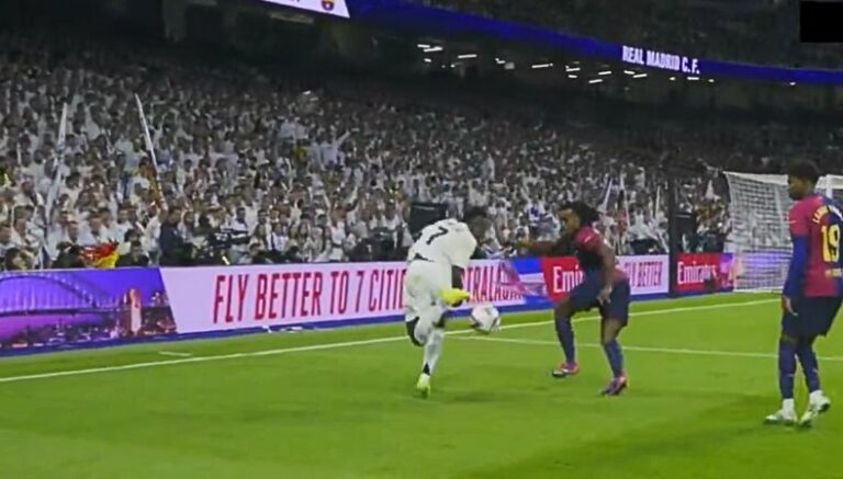 Una gambeta de fantasía quería hacer Vinicius contra sus rivales del Barcelona; pero no le salió lo que parecía una jugada destacada como las que solía hacer Neymar, quien no concretó dicho gesto técnico.