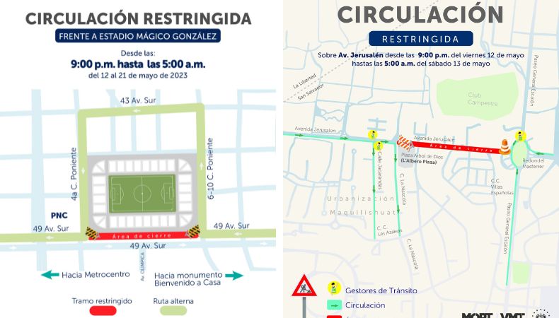 A través de la cuenta oficial de Twitter del VMT, anunció el paso restringido de dos avenidas muy concurridas de tránsito en San Salvador. En primer lugar, se limita la circulación frente al estadio Jorge «Mágico» González, en la 49 avenida sur, sobre los carriles que se dirigen hacia Metrocentro.