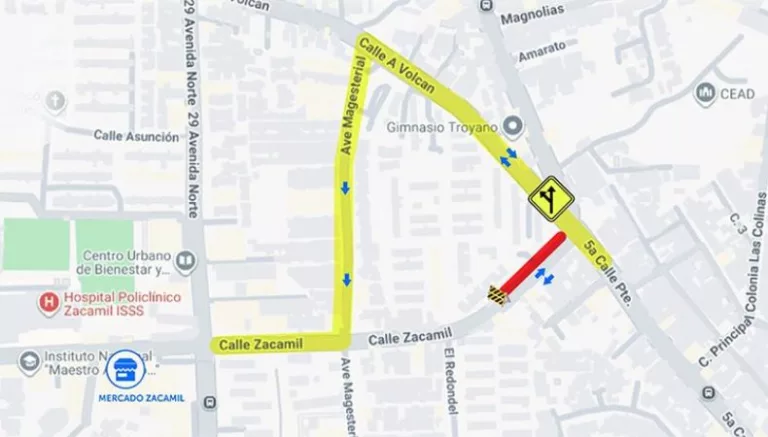 A partir del sábado 2 de mayo se realizará el cierre de un carril en la calle Zacamil, intersección con Calle al Volcán y 5 av. Norte, debido a obras en la zona.