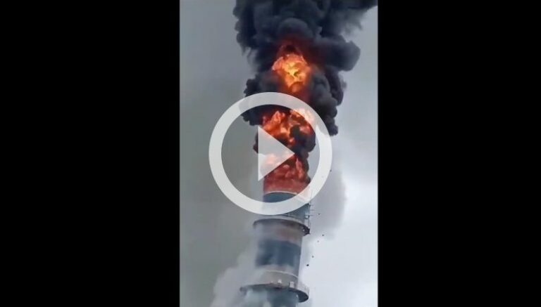 En redes sociales, impactantes videos fueron difundidos y evidencian la magnitud de las llamas que consumen la estructura y terminan provocando el colapso de la torre de desulfuración de gases de combustión.