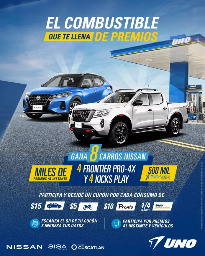 UNO arrancó con fuerza el último trimestre del año presentando su promoción “El combustible que te llena de premios”, una iniciativa pensada para premiar la preferencia y fidelidad de sus clientes. Con esta nueva campaña, los salvadoreños podrán participar para ganar ocho vehículos Nissan (cuatro Frontier Pro-4X y cuatro Kicks Play), además de miles de premios al instante y 500,000 MultiPuntos Cuscatlán.