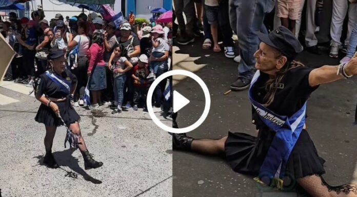 Sin embargo, lo que nadie se esperaba es que entrara junto a la marcha de la PNC, luciendo el traje característico de los policías, adaptado a su gusto. A la vez, una banda con los colores azul y blanco, que la proclamó como “la reina de la independencia”.