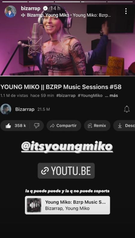 Young Miko se hizo presente para reaccionar ante su nuevo proyecto musical con el argentino, en el que dejó entre ver que dicha sesión fue bastante especial para ella. “Esta sesión sale del corazón, para mí y para los míos. Están bienvenidos para disfrutársela con su gente y con nosotros, como yo me disfruté hacerla”, destacó.